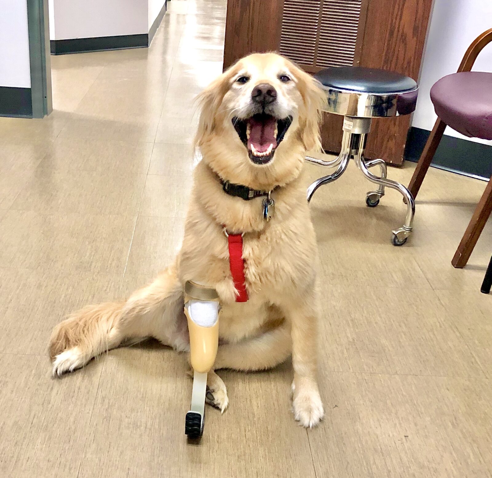 Golden Retriever with prosthetic dog leg, sitting